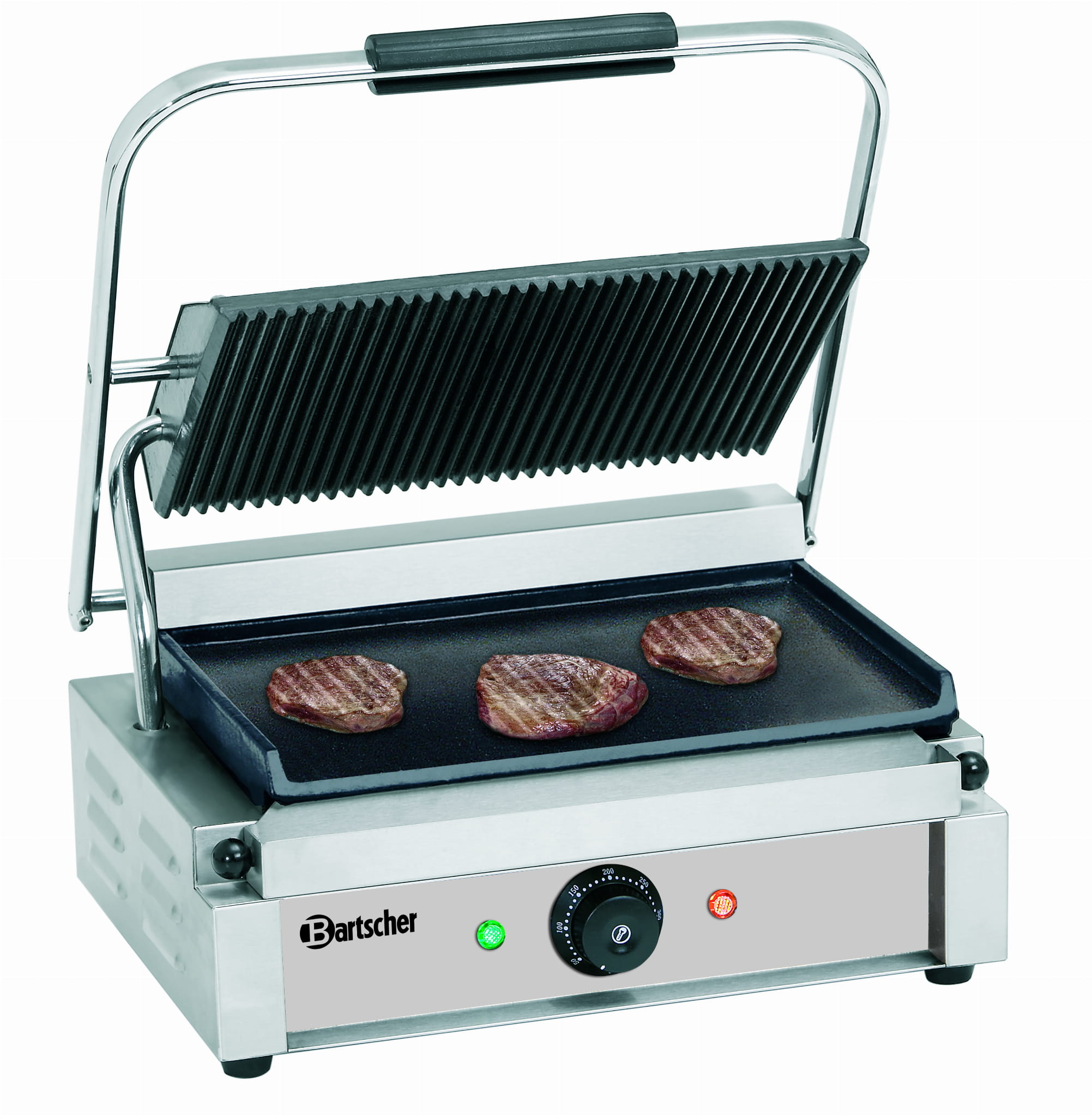 Producentem opiekacza jest firma Bartscher, która od lat tworzy profesjonalne grille i inne sprzęty kuchenne. Wymiary opiekacza to 410mm szerokości, 400 mm głębokości i 200 mm wysokości. Produkt posiada jedno duże stanowisko grillujące. Wymiary górnej płyty grillującej to 220 mm głębokości i 335 mm szerokości, dolna płyta ma 230 mm głębokości i 335 mm szerokości. Obie płyty są wykonane z emaliowanego żeliwa, a obudowa ze stali szlachetnej. Góra powierzchni grillowej jest ryflowana, natomiast dół gładki.
