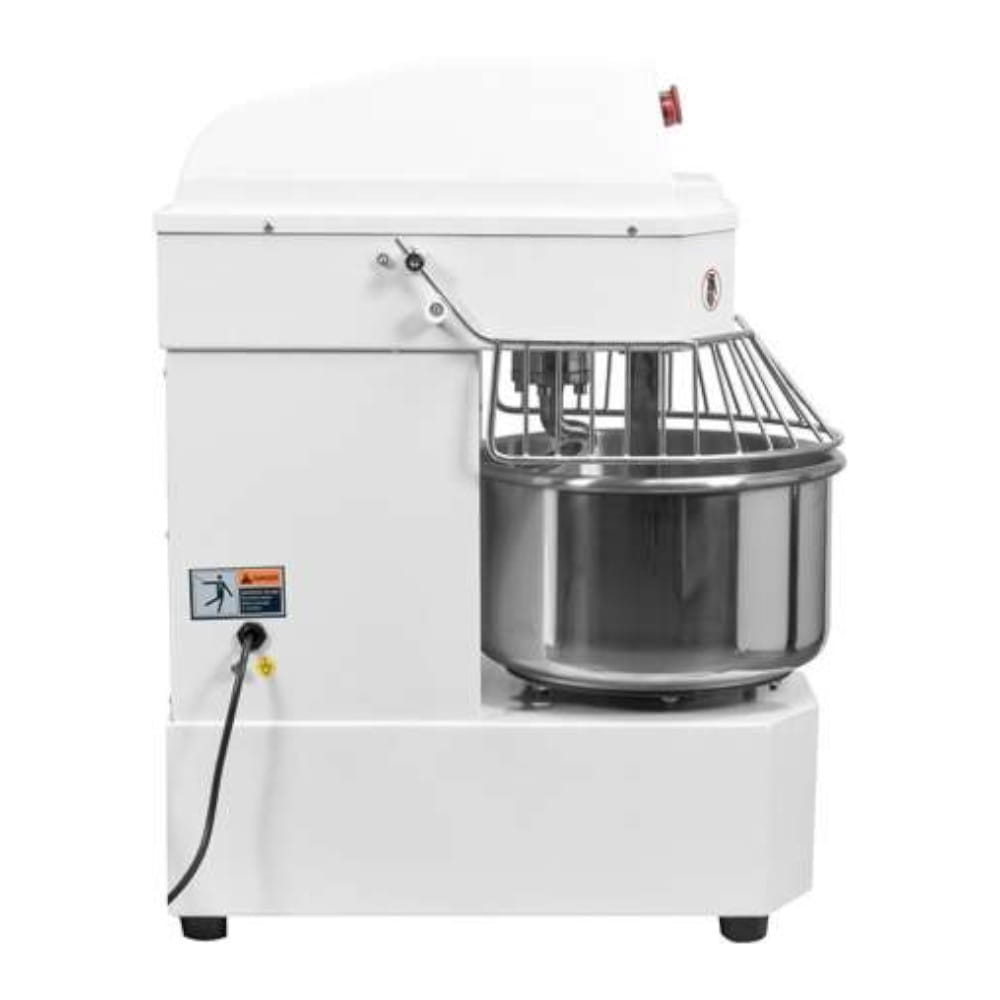 Szczególnie polecany do pizzerii, piekarni, cukierni. Napędzany jest silnikiem o mocy 1500W, zasilany prądem 220~240V / 50Hz, za pomocą przekładni zębatkowej, która gwarantuje bardzo długą żywotność mechanizmu i użytkowania. Natomiast przeniesienie napędu następuje za pomocą paska napędowego, co ma szczególne znaczenie podczas serwisu urządzenia, ułatwiając jego wymianę. Dzieża wraz ze spiralą obracają się jednocześnie ze stałą prędkością 247 obr/min. Mikser o wymiarach 860x700x390mm waży 85kg. Korps wykonany z aluminium i stali malowany w kolorze białym jest łatwy w utrzymaniu w czystości. Natomiast dzieża oraz akcesoria dodatkowe zrobione są ze stali nierdzewnej przeznaczonej do kontaktu z żywnością.