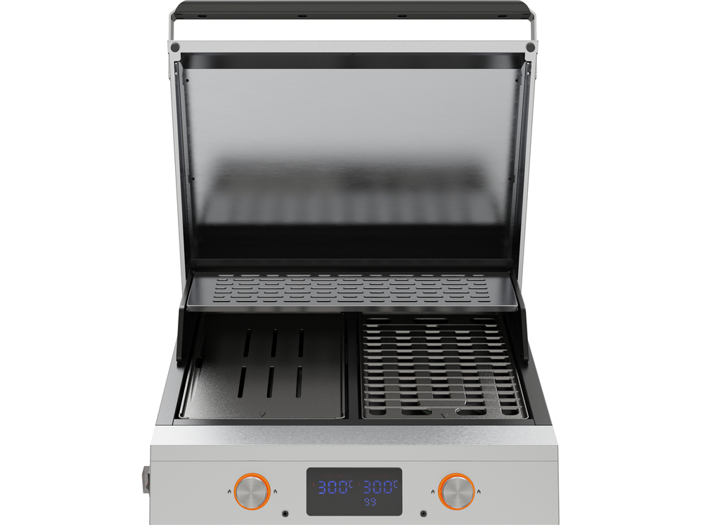 Grill elektryczny z serii Yatomi o mocy 2300W i żeliwnym rusztem doskonale sprawdza się w kuchni, na tarasie i w ogrodzie. 2 odrębnie sterowane strefy grillowania zapewniają niezależność obróbki. Możliwość wyboru innej temperatury i czasu pracy, a także sprawdzania temperatury składników za pomocą dołączonej sondy pozwalają na przyrządzenie idealnie wysmażonych produktów z zachowaniem ich soczystości i naturalnego smaku. Możliwość montażu na dedykowanym wózku YG-20072 podnosi komfort użytkowania, zwiększa mobilność i organizację przestrzeni.