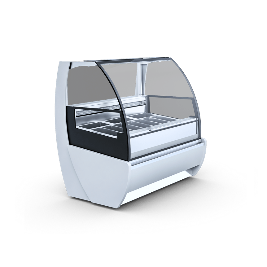 Dystrybutor do lodów Igloo, model KAMELEO ICE wyróżnia się niebanalną i atrakcyjną stylistyką. Front urządzenia stanowi uchylna, gięta szyba z sitodrukiem w kolorze czarnym, zapewniając idealny wgląd na ekspozycję i wybór odpowiedniego smaku lodów. W wyposażeniu standardowym znajduje się wewnętrzny agregat mroźniczy, chłodzenie dynamiczne, przestrzeń ekspozycyjna i blat roboczy, wykonany ze stali nierdzewnej. Kolor paneli frontowych oraz boków i szabli bocznych z drewna można wybrać z wzornika fornit, który znajduje się w galerii zdjęć.