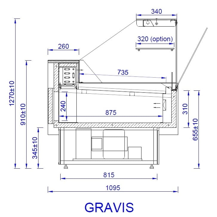 Lada chłodnicza GRAVIS producenta Mawi to urządzenie wyposażone w agregat wewnętrzny, chłodzenie statyczne, szybę przednią uchylną, ekspozycję o głębokości 73,5 cm, blat roboczy ze stali nierdzewnej oraz mięsne oświetlenie LED. Ponadto urządzenie pracuje w zakresie temperatury od +1 do +10°C. Lada sklepowa GRAVIS posiada szeroka gamę dostępnych rozmiarów (długość od 102 do 383,4 cm). Podczas konfiguracji prosimy o wybranie odpowiedniej długości. Boki wraz z podstawą i frontem po ustaleniu z działem handlowym mogą zostać pomalowane na dowolny kolor wybrany z PALETY RAL dostępnej w galerii zdjęć.