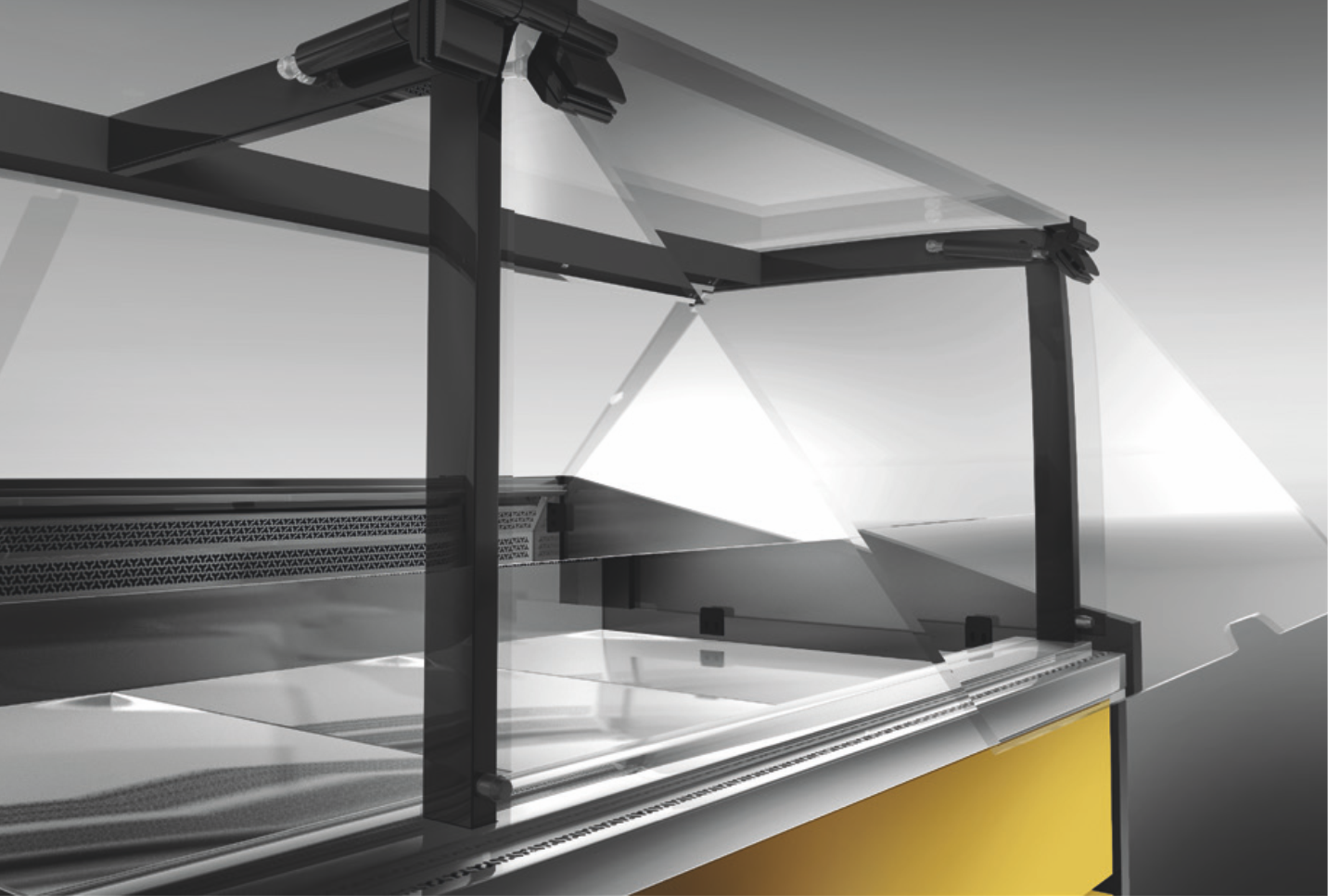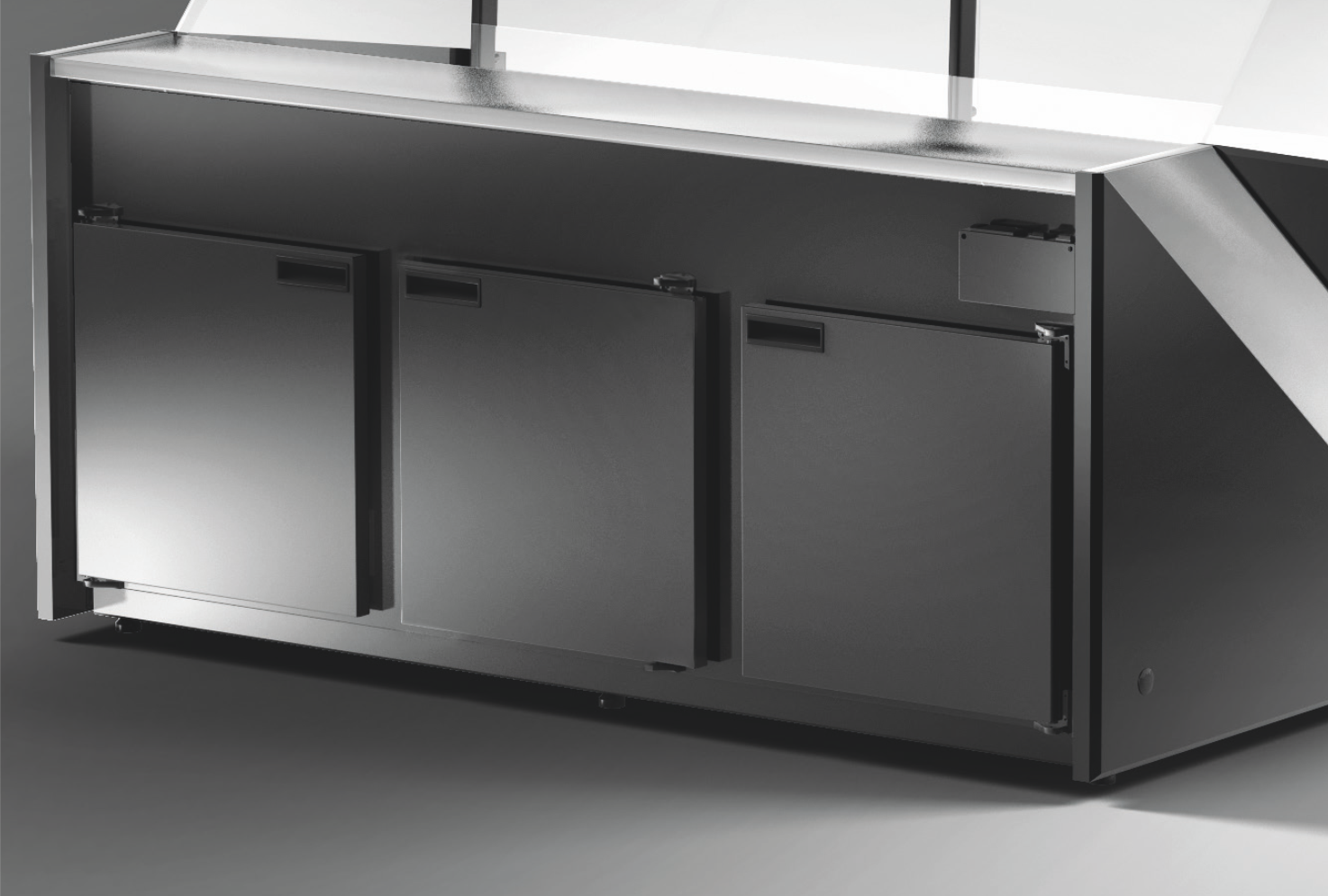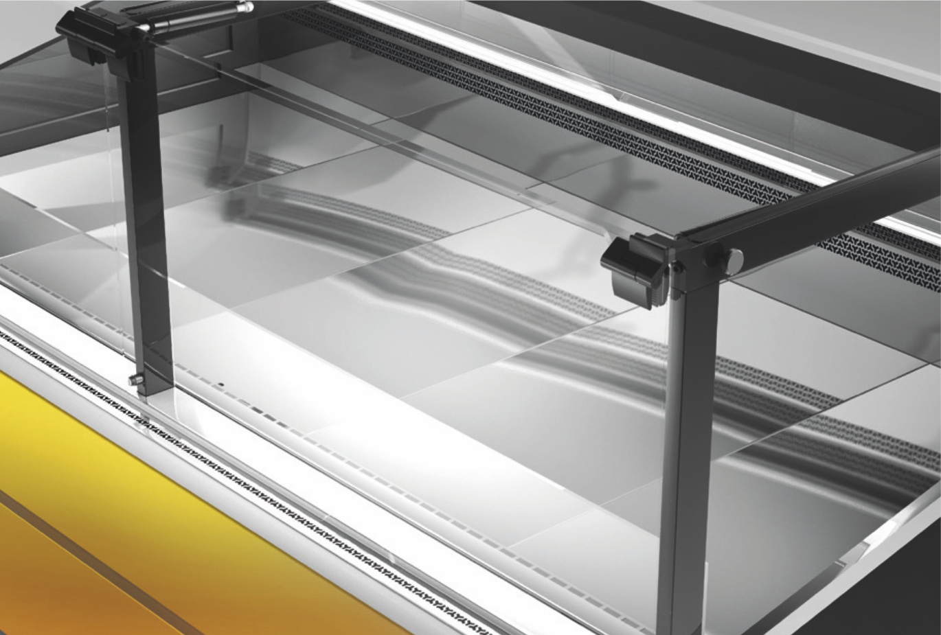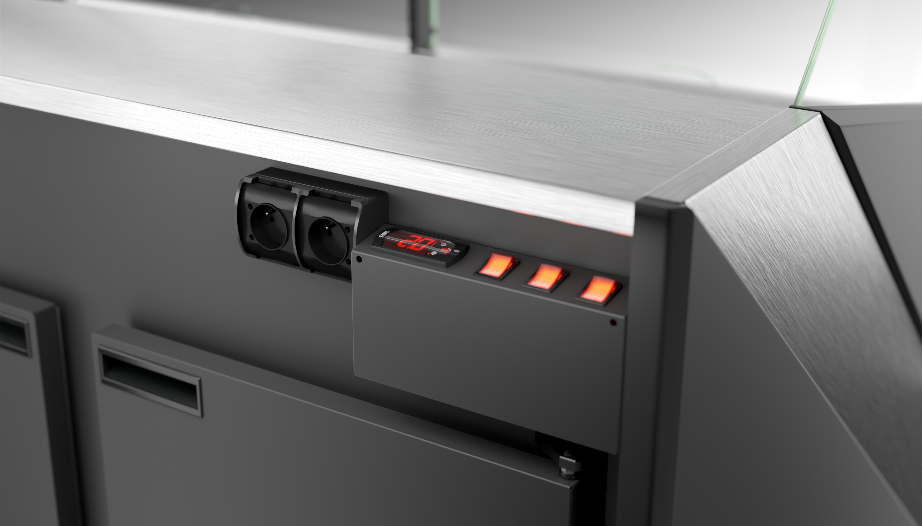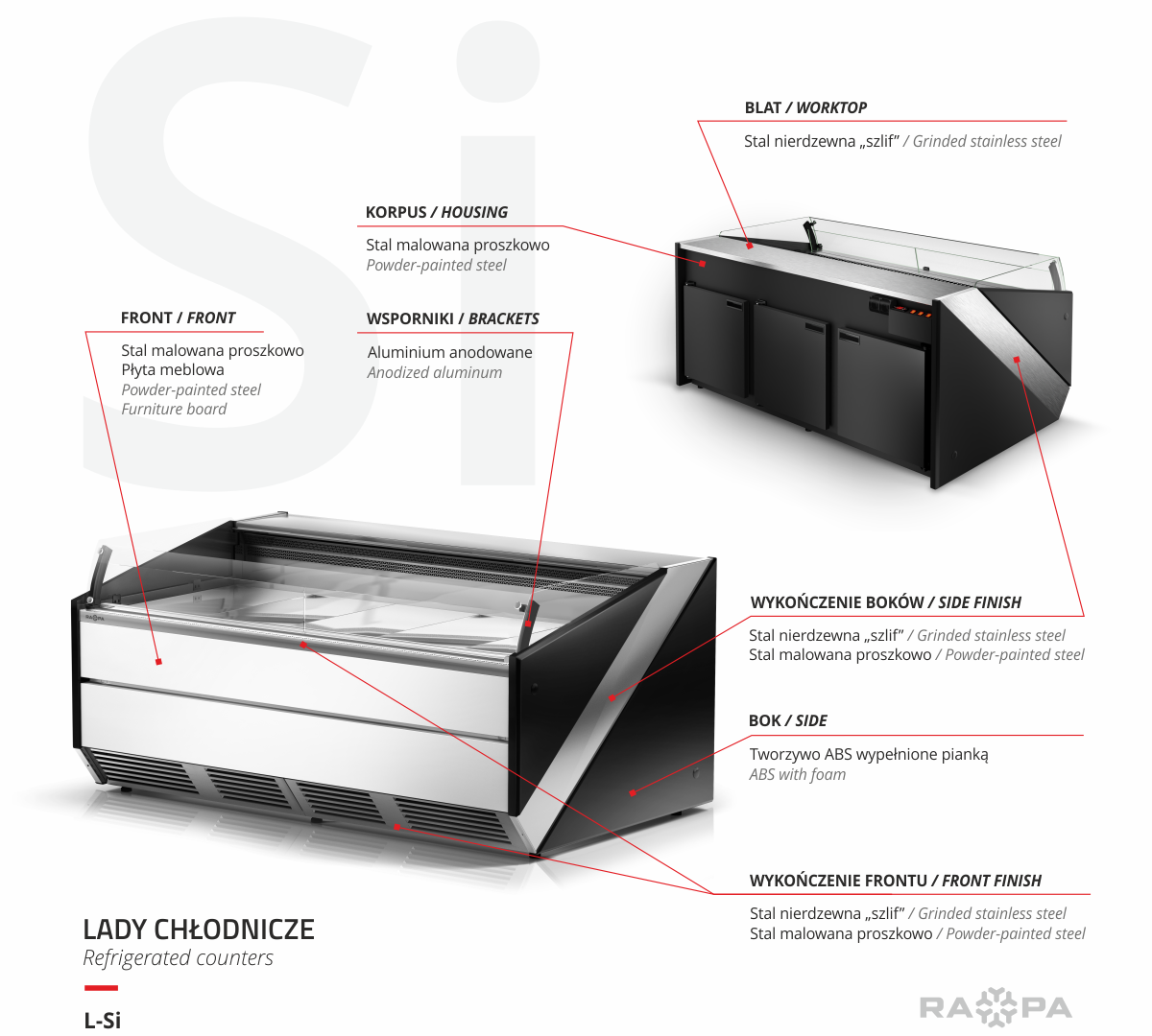 Lada sklepowa L-S, RAPA to urządzenie z giętą szybą czołową, wyróżniające się systemem otwierania szyb na siłownikach typu lift-up, co pozwala zwiększyć wygodę i komfort użytkowania urządzenia. Cała konstrukcja opiera się na anodowanych profilach aluminiowych w kolorze głębokiej czerni. Wbudowany agregat chłodniczy oraz chłodzenie dynamiczne sprawia, że produkty są idealnie schładzane w szybki i równomierny sposób. Przechowywanie produktów spożywczych w temperaturze w zakresie +1°C ÷ +10°C pozwala zachować walory smakowe, wygląd oraz jakość na dłuższy czas. Blat w urządzeniu wraz z przechowalnikiem oraz dnem części ekspozycyjnej został wykonany ze stali nierdzewnej. Atutem lady chłodniczej RAPA jest przede wszystkim zwiększony przechowalnik, który pomieści od 4 do 8 pojemników EURO 2.