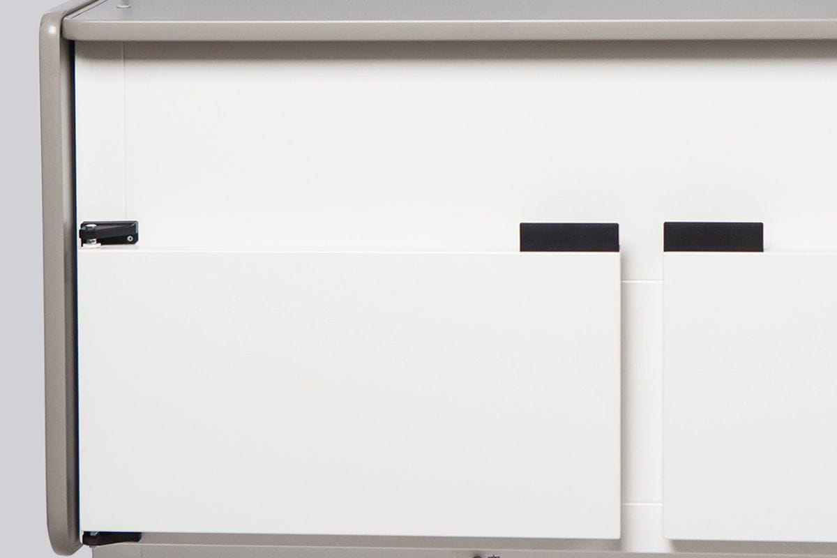 - Korpus malowany na kolor biały ze wzornika RAPA, drzwi przechowalnika w kolorze korpusu z uszczelką magnetyczną, wykończenie frontu szarymi odbojnikami z miękkiego PVC, boki z szarej płyty laminowanej, kolorowe wykończenie frontu urządzenia