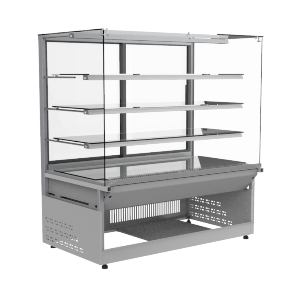Witryna cukiernicza Estera WCh-1/C 134/83 producenta Cebea to profesjonalne urządzenie chłodnicze służące do przechowywania oraz eksponowania wyrobów cukierniczych. Produkty takie jak ciasta, torty czy desery wymagają przebywania w odpowiedniej temperaturze, aby zachować na jak najdłuższy czas swoją wysoką jakość oraz efektowny wygląd. Estera pozwala zachować wyroby cukiernicze w temperaturze od +5°C do +15°C. Producent Cebea Bochnia zastosował w ciastkarce układ chłodniczy z wymuszonym obiegiem powietrza oparty na agregacie wewnętrznym, dzięki czemu temperatura w przestrzeni ekspozycyjnej liczącej pojemność 450 litrów jest rozłożona równomiernie. Dodatkowo szyba frontowa prosta, przeszklona z czterech stron wraz z oświetleniem LED wszystkich półek w barwie cukierniczej, gwarantuje doskonałą widoczność produktów, co zwraca uwagę klientów. Ponadto w ladzie cukierniczej Estera zastosowano automatyczne odparowanie skroplin oraz drzwi przesuwne z szybą zespoloną.