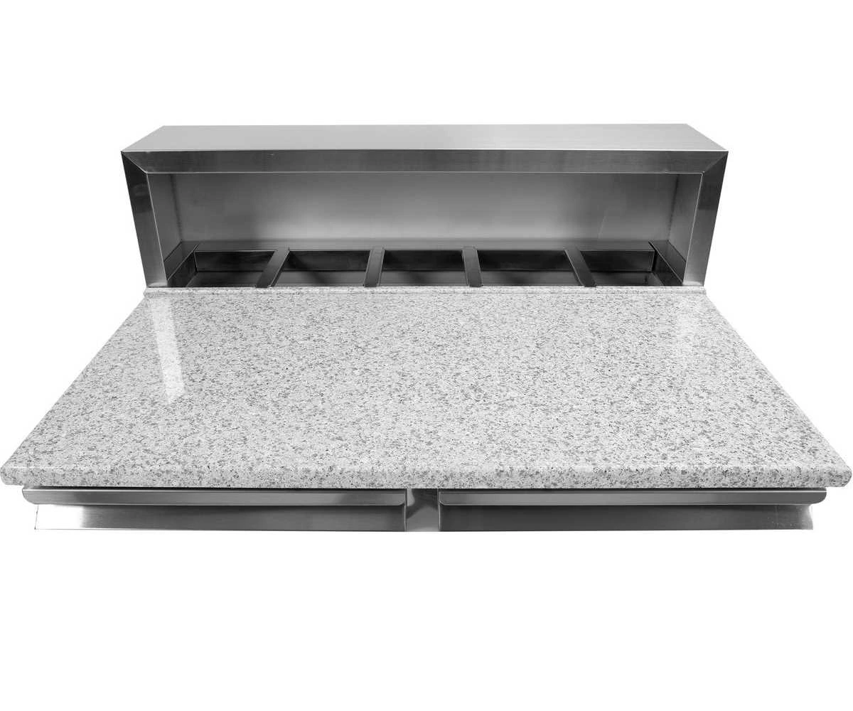 Stół chłodniczy o pojemności 240 litrów łączy w jednej konstrukcji funkcję przechowywania i wygodną przestrzeń roboczą. Blat wykonany z marmuru nadaje się do pracy z ciastem, świeżymi produktami czy półproduktami wymagającymi stabilnej powierzchni. Na górze umieszczono praktyczną nadstawkę ze stali nierdzewnej 201, wyposażoną w otwór mieszczący pięć pojemników GN 1/6 – idealnych do uporządkowania dodatków i składników używanych na bieżąco.
