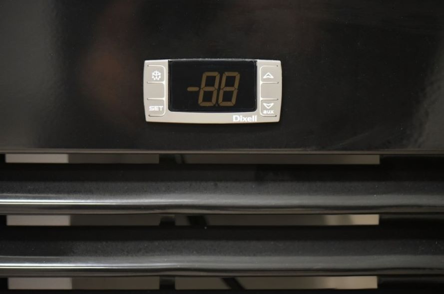 Za stabilne warunki chłodnicze odpowiada system chłodzenia nawiewowego z wentylatorem, który równomiernie rozprowadza zimne powietrze w całej komorze. Cyfrowy termostat z automatycznym odszranianiem pozwala kontrolować temperaturę w zakresie od 0 do 10°C, a samoczynne odparowanie skroplin ogranicza konieczność ręcznej obsługi. Cichy agregat zapewnia komfort pracy nawet w niewielkich pomieszczeniach sprzedażowych. Smukła, czarna obudowa nadaje urządzeniu elegancki i profesjonalny charakter, dzięki czemu witryna staje się atrakcyjnym elementem wyposażenia wnętrza. Przy pojemności 830 litrów oraz wymiarach 1000 x 745 x 2040 mm szafa oferuje dużą przestrzeń ekspozycyjną. Kółka transportowe ułatwiają przestawianie urządzenia, a izolacja z ekologicznej pianki poliuretanowej o grubości 50 mm pomaga utrzymać efektywność energetyczną. Zużycie energii to ok. 3,2 kWh/24h.
