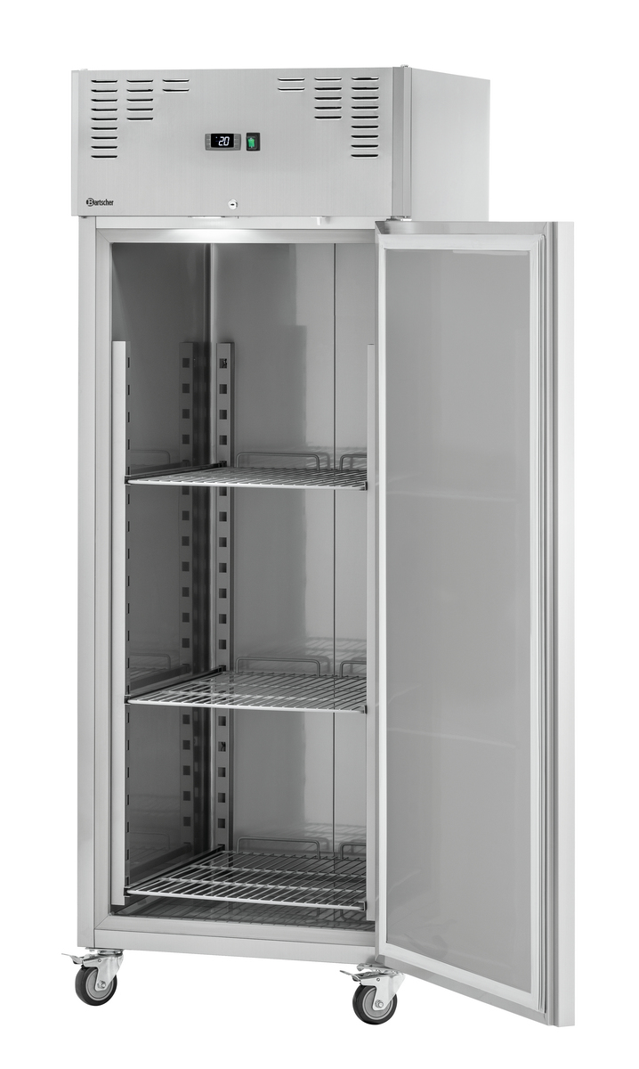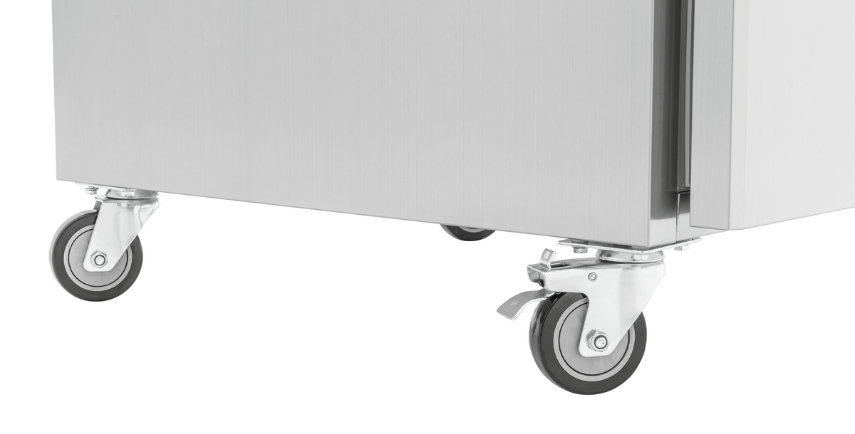 Dzięki dużej ilości miejsca wewnątrz chłodzone produkty można przechowywać w przejrzysty sposób na regałach w formacie 2/1 GN o regulowanej wysokości. Wydajne chłodzenie cyrkulacyjne lodówki ze stali nierdzewnej zapewnia równomierną i stałą temperaturę wewnątrz mimo jej rozmiarów.