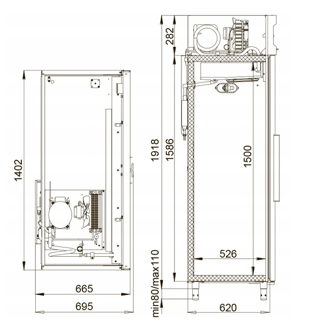 Gastronomiczna szafa chłodnicza jest wykonana ze stali nierdzewnej. Urządzenie ma pojemność 1000 litrów i wyposażone jest w chłodzenie nawiewowe, które jest wymuszane wentylatorem. Agregat jest umieszczony u góry i charakteryzuje się cichą i energooszczędną pracą. Szafa posiada automatyczne odszranianie oraz odparowywanie skroplin. Drzwi są samozamykające się i posiadają zamek na klucz.