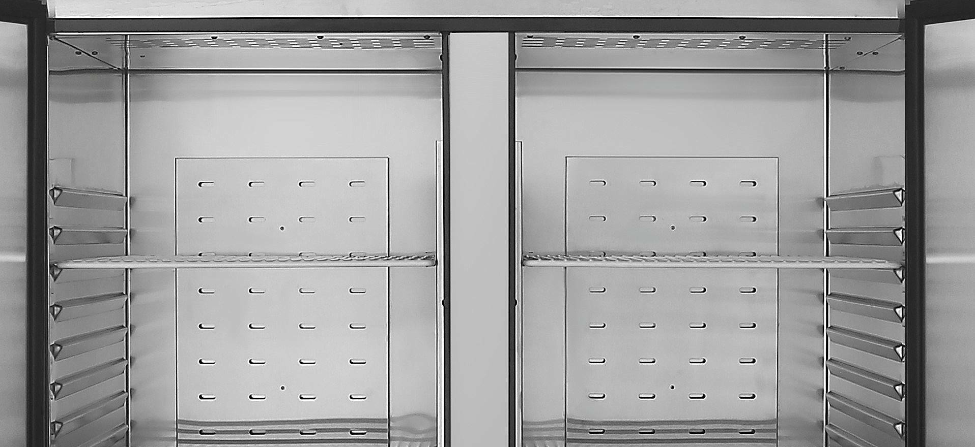 Obudowa zewnętrzna, jak i wewnętrzna zostały wykonane ze stali nierdzewnej AISI 304. Za stabilną temperaturę odpowiada system chłodzenia wentylowanego, który rozprowadza chłód w całej przestrzeni. Zakres pracy od -2 do +8°C pozwala na bezpieczne przechowywanie różnorodnych produktów. Automatyczne odszranianie Air Defrost usprawnia eksploatację, ograniczając konieczność ręcznej obsługi i zapewniając ciągłość pracy urządzenia. Szafa została wyposażona w intuicyjne sterowanie cyfrowe Elitech. Wnętrze zawiera energooszczędne oświetlenie LED, poprawiające widoczność produktów. Samozamykające się drzwi z magnetycznymi uszczelkami oraz gruba, 90-milimetrowa izolacja poprawiają efektywność energetyczną. Średnie roczne zużycie energii w oferowanym modelu wynosi ok. 503 kWh. W urządzeniu zastosowano ekologiczny czynnik chłodniczy R600a.