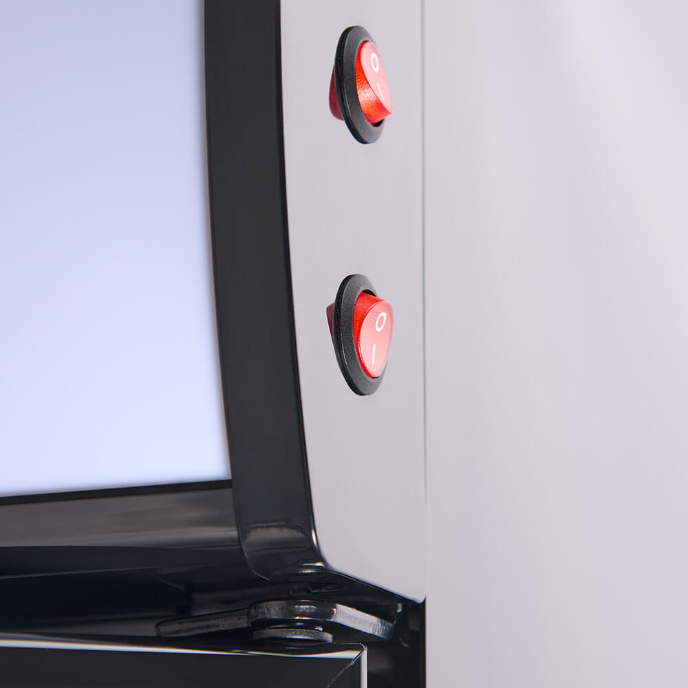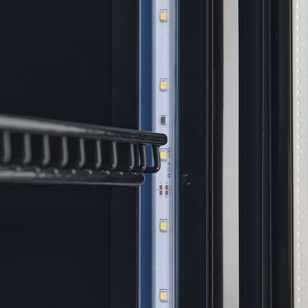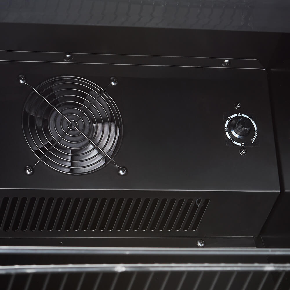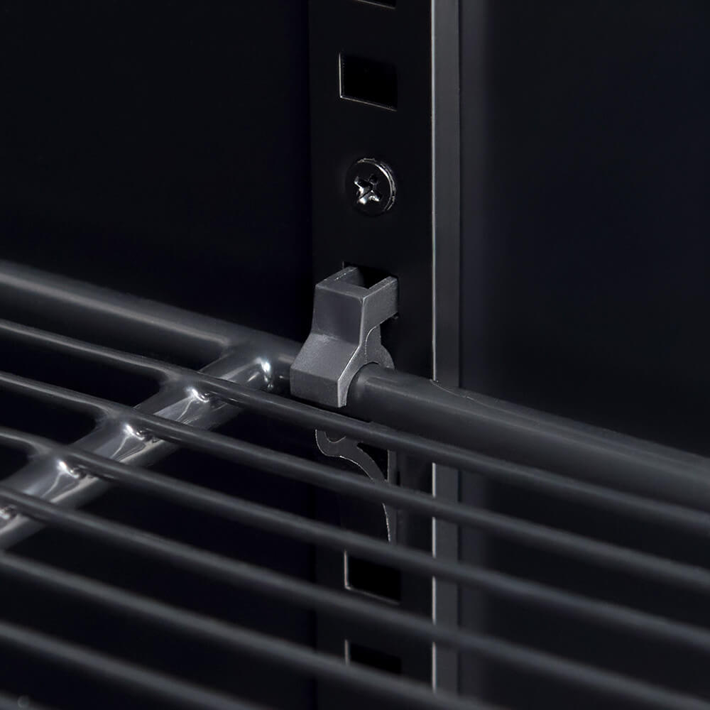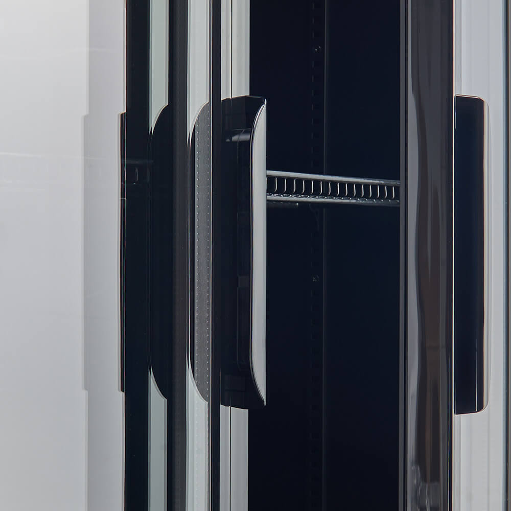 Wnętrze wykonane jest ze stali malowanej w kolorze grafitowym, a czarne półki podkreślają nowoczesny wygląd urządzenia. Dla wygody użytkownika szafa została wyposażona w cztery kółka, z czego dwa posiadają hamulce, co ułatwia przemieszczanie i stabilne ustawienie sprzętu. Agregat chłodniczy umieszczony z tyłu zwiększa komfort użytkowania oraz przestrzeń ekspozycyjną. Urządzenie charakteryzuje się klasą energetyczną D, wykorzystuje ekologiczny czynnik chłodniczy R600a i zużywa 612 kWh energii rocznie, co odpowiada 1,67 kWh na dobę. Wymiary zewnętrzne to 577 x 605 x 1978 mm.
