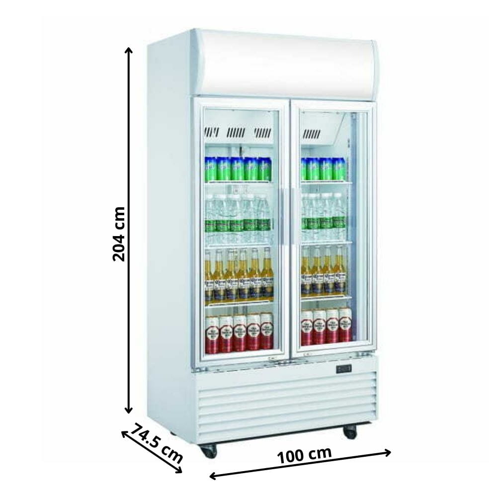 Przeszklona szafa/witryna chłodnicza z drzwiami otwieranymi o pojemności użytkowej 800 litrów z obudową metalową malowaną proszkowo na kolor biały. Drzwi posiadają hartowaną szybę oraz ramę i uchwyt wykonane z wytrzymałego tworzywa PVC w kolorze białym. Urządzenie wyposażone jest w chłodzenie nawiewowe (wymuszone wentylatorem). Urządzenie doskonale nadaje się do różnego rodzaju punktów gastronomicznych tj. sklepy, bary, pizzerie, kawiarnie, fast-food'y, puby itp.