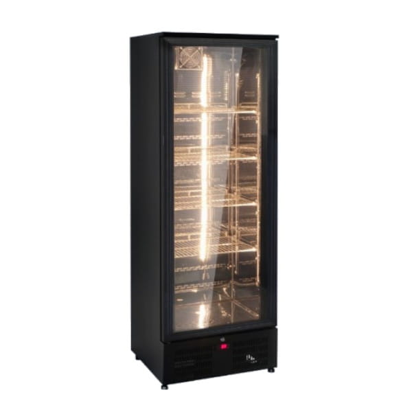 Temperatura, jaka panuje w witrynie chłodniczej przeszklonej mieści się w zakresie 2-8 °C. Umieszczając asortyment wewnątrz mamy do wykorzystania cztery półki. Można je ulokować na dowolnie wybranej wysokości. Ekspozycja wspomagana jest oświetleniem LED. Obudowa szafy przeszklonej wykonana została ze stali i ma czarny kolor. Produkt marki PROBOX podlega sterowaniu elektronicznemu.