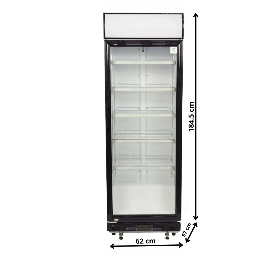 Wymiary zewnętrzne produktu to 620 x 570 x 1845 mm. Pojemność użytkowa szafy przeszklonej do gastronomii to 350L. Obudowa jest wykonana ze stali (kolor biały). Zakres temperatury wynosi od 0 do +10°C. Szafa wykorzystuje czynnik chłodniczy R600.