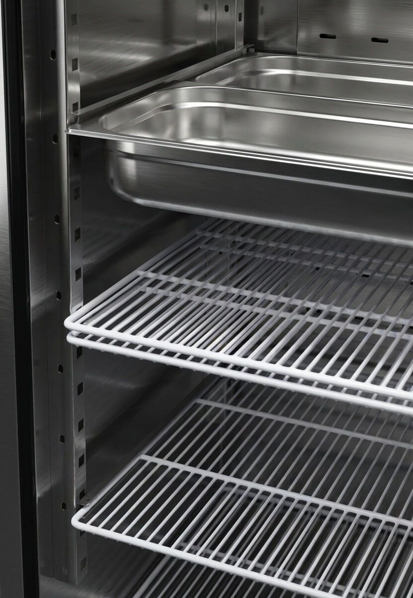 Urządzenie jest wyposażone w elektroniczne sterowanie z cyfrowym wyświetlaczem temperatury, umożliwiające monitorowanie i regulację warunków mroźniczych. Komfort użytkowania zwiększa wyłącznik wentylatora aktywowany przy otwarciu drzwi oraz system chłodzenia nawiewowego z wymuszonym obiegiem powietrza. Agregat skraplający EMBRACO/ASPERA charakteryzuje się cichą i energooszczędną pracą. Sprzęt posiada funkcję automatycznego odszraniania i odparowania skroplin. Szafa posiada trzy półki rusztowe GN2/1 z metalowym plastyfikowanym wykończeniem, samozamykające się drzwi z zamkiem na klucz oraz regulowane nogi w zakresie do 50 mm, co ułatwia dopasowanie urządzenia do warunków lokalowych.