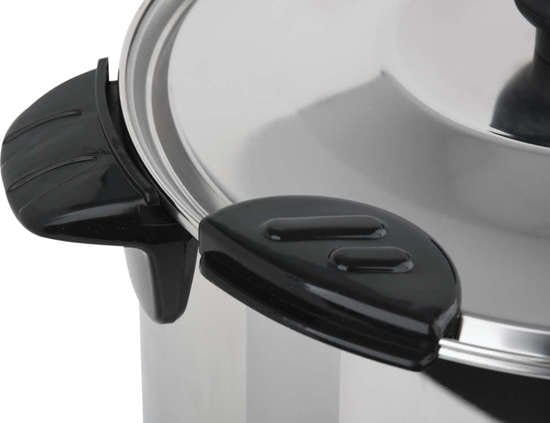 - Na zewnątrz pojemnika znajduje się wskaźnik poziomu wody ze skalą wyrażoną w litrach. Po obu stronach są wygodne, nienagrzewające się uchwyty do przenoszenia. Ich konstrukcja stanowi jednocześnie system TWIST-LOCK dzięki czemu możliwe jest szczelne zamknięcie pokrywki.