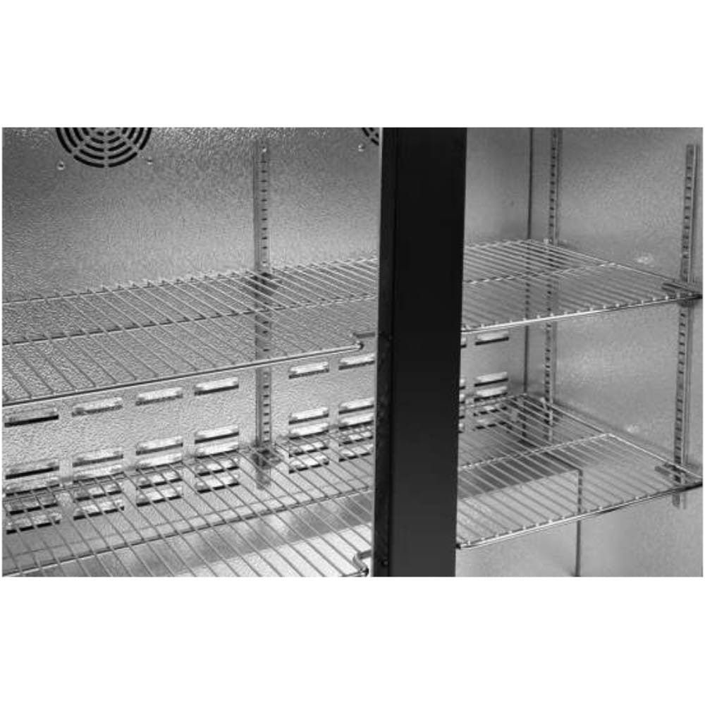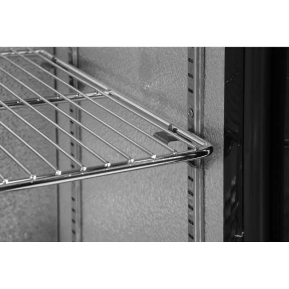 Przesuwne, hartowane drzwi samozamykające wyposażone w zamki ułatwiają pracę w miejscach o ograniczonej przestrzeni i wysokiej rotacji towarów. Takie rozwiązanie eliminuje problem kolizji z innymi elementami wyposażenia i pozwala na swobodne działanie kilku pracowników jednocześnie – szczególnie przy intensywnym serwisie. Wnętrze o pojemności 227 litrów opiera się na czterech stalowych półkach w rozmiarze 835 x 350 mm, każdej o nośności 40 kg. Układ półek umożliwia optymalne zagospodarowanie miejsca zarówno pod małe butelki, jak i pod większy asortyment.