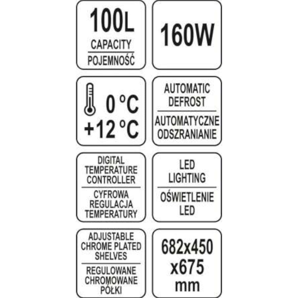 Nadstawka chłodnicza YATO ma pojemność 100L i posiada dwie chromowane półki o regulowanej wysokości. Dostęp do nich odbywa się za pośrednictwem przesuwanych drzwiczek szklanych. Wykonane są one ze szkła hartowanego, podobnie jak panoramiczna zaokrąglona szyba przednia. Zapewnia to dużą wytrzymałość, a jednocześnie bardzo dobre właściwości izolujące.